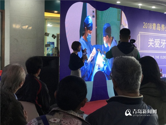 老人通過大屏幕直播觀看種牙過程。