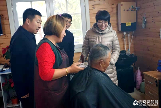 新時(shí)代文明實(shí)踐膠東分中心愛心發(fā)屋里,理發(fā)師正為村民理發(fā)。