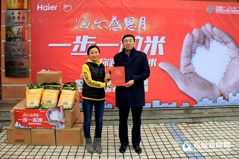海爾集團(tuán)青島分公司總經(jīng)理顧肖慧(右)為社會(huì)福利院送上公益大米。