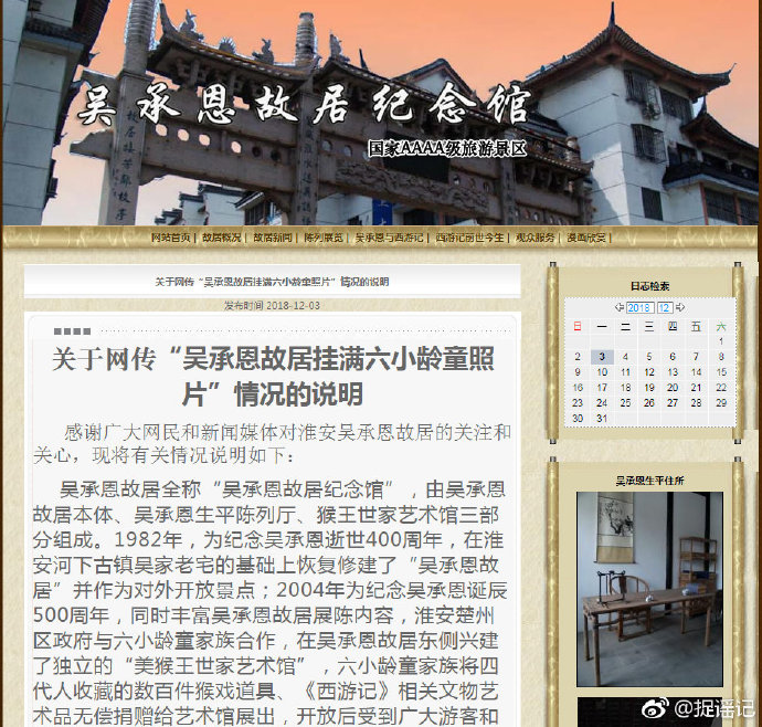 吳承恩故居全稱“吳承恩故居紀(jì)念館”,由吳承恩故居本體、吳承恩生平陳列廳、猴王世家藝術(shù)館三部分組成。1982年,為紀(jì)念吳承恩逝世400周年,在淮安河下古鎮(zhèn)吳家老宅的基礎(chǔ)上恢復(fù)修建了“吳承恩故居”并作為對(duì)外開(kāi)放景點(diǎn);2004年為紀(jì)念吳承恩誕辰500周年,同時(shí)豐富吳承恩故居展陳內(nèi)容,淮安楚州區(qū)政府與六小齡童家族合作,在吳承恩故居?xùn)|側(cè)興建了獨(dú)立的“美猴王世家藝術(shù)館”,六小齡童家族將四代人收藏的數(shù)百件猴戲道具、《西游記》相關(guān)文物藝術(shù)品無(wú)償捐贈(zèng)給藝術(shù)館展出,開(kāi)放后受到廣大游客和社會(huì)各界的廣泛贊譽(yù);2005年,區(qū)政府又在吳承恩故居西側(cè)建立了吳承恩生平陳列廳,展示吳承恩生平及相關(guān)《西游記》文化。包括美猴王世家藝術(shù)館在內(nèi)的全部展陳內(nèi)容,均由專業(yè)機(jī)構(gòu)設(shè)計(jì)并經(jīng)專家評(píng)審,六小齡童本人及家族從未參與展陳設(shè)計(jì),也未領(lǐng)取過(guò)任何報(bào)酬。