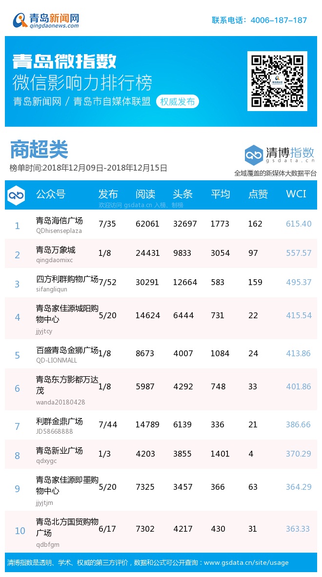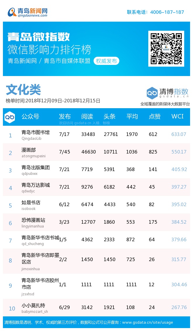 青島新聞網(wǎng)12月17日訊(記者 邢書玲)由青島新聞網(wǎng)、清博指數(shù)平臺(tái)聯(lián)手打造的“青島微指數(shù)微信影響力排行榜”今日發(fā)布一周(12月9日-12月15日)榜單。