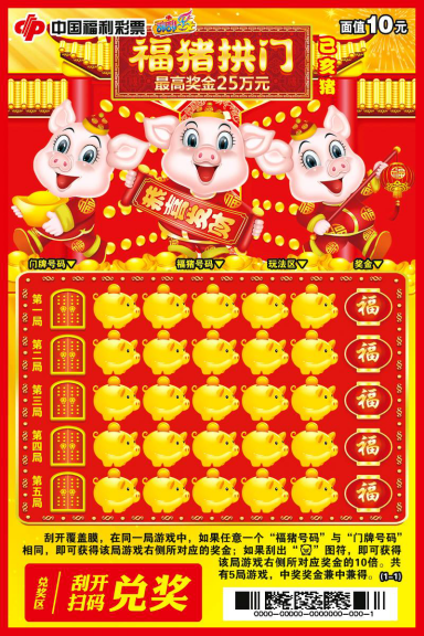 游戲規(guī)則:刮開覆蓋膜,在同一局游戲中,如果任意一個(gè)“福豬號(hào)碼”與“門牌號(hào)碼”相同,即可獲得該局游戲右側(cè)所對(duì)應(yīng)的獎(jiǎng)金;如果刮出“”圖符,即可獲得該局游戲右側(cè)所對(duì)應(yīng)獎(jiǎng)金的10倍。共有5局游戲,中獎(jiǎng)獎(jiǎng)金兼中兼得。