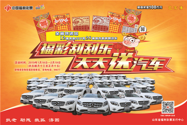 2019年1月18日—2月19日(農(nóng)歷臘月十三至正月十五),在山東省內(nèi)購買福彩刮刮樂“己亥豬”5元、10元、20元彩票任意品種,用手機(jī)掃描玩法區(qū)內(nèi)的二維碼參與抽獎(jiǎng)活動(dòng),就有機(jī)會(huì)獲得奔馳SUV或別克新威朗汽車。