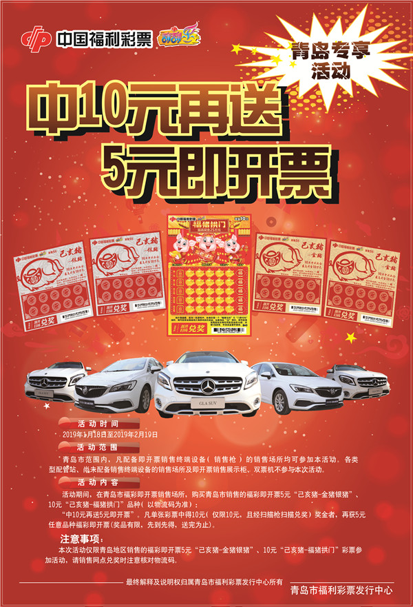 2019年1月18日—2月19日,在青島市范圍內(nèi)配備即開票銷售終端設(shè)備(銷售槍)的銷售場所購買青島市銷售的福彩即開票5元“己亥豬-金豬銀豬”、10元“己亥豬-福豬拱門”品種(以物流碼為準(zhǔn)):“中10元再送5元即開票”。凡單張彩票中得10元(僅限10元,且經(jīng)掃描槍掃描兌獎(jiǎng))獎(jiǎng)金者,再獲5元任意品種福彩即開票(獎(jiǎng)品有限,先到先得,送完為止)。