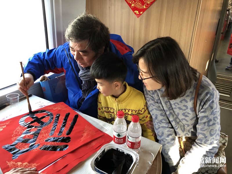 車廂內(nèi),青島市文聯(lián)黨組書記、副主席魏勝吉與范國強(qiáng)、張景、趙善亭、郭強(qiáng)、宋文京、姜樂平、張耀輝、倪漢嬰、王秀泉、蘇萬利等10余位青島書法名家揮毫潑墨,將幅幅寫滿春節(jié)祝福的大紅福字及春聯(lián)送到列車乘務(wù)組人員及返鄉(xiāng)務(wù)工人員手中,為他們送上春節(jié)祝福。對(duì)他們?yōu)榍鄭u城市建設(shè)的付出表達(dá)敬意。