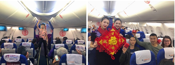 2019年2月6日,在青島飛往廣州的SC4675航班上,山航客艙部青島大隊(duì)郭麗媛魯雁乘務(wù)組與飛機(jī)上的160名旅客一同歡度新春,紀(jì)念幸福時(shí)光。