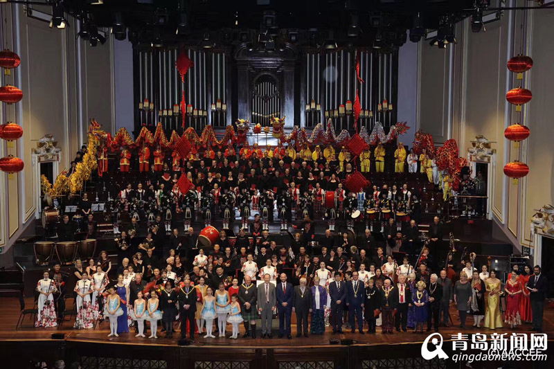 中國農(nóng)歷大年初五,愛丁堡亞瑟廳被大紅燈籠點綴,這座1914年起開放的音樂廳,洋溢著歡樂吉祥的新春氛圍。音樂會開始前,中國駐愛丁堡總領(lǐng)事潘新春先生與愛丁堡市長弗蘭克·羅斯先生共同為中國龍點睛,寓意著新年的吉祥如意。今年的新春音樂會集結(jié)優(yōu)秀的專業(yè)藝術(shù)團(tuán)隊,演員人數(shù)約300人,陣容強(qiáng)大。青島市歌舞劇院民樂團(tuán)作為特邀嘉賓,為蘇格蘭當(dāng)?shù)赜^眾展示了中國民族樂器的魅力?!段业淖鎳?、《絲綢之路》用激昂澎湃的樂章,呈現(xiàn)祖國錦繡山河的壯闊;《慶典序曲》、《好日子》洋溢著新春佳節(jié)的喜慶和歡樂。其中不少曲目經(jīng)過全新編曲,寓意深遠(yuǎn)。青島市歌舞劇院民族樂團(tuán)和愛丁堡交響樂團(tuán)共同奏響《花好月圓》傳遞出團(tuán)圓喜慶的美好愿望;愛丁堡合唱團(tuán)用中文唱響《茉莉花》;創(chuàng)新編曲的蘇格蘭民族歌曲《友誼地久天長》集結(jié)民族樂團(tuán)、交響樂團(tuán)、合唱團(tuán)以及風(fēng)笛隊的默契演奏,在音樂會最后掀起了高潮,傳遞出兩國友誼長久美好發(fā)展的祝福。