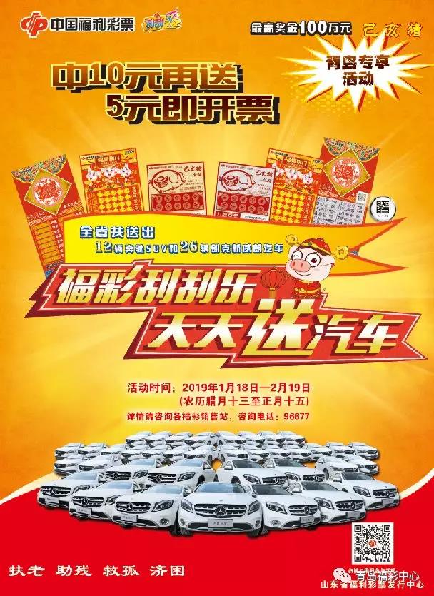 2019年1月18日—2月19日,在山東省內(nèi)購買福彩刮刮樂“己亥豬”5元、10元、20元彩票任意品種,用手機掃描玩法區(qū)內(nèi)的二維碼參與抽獎活動,就有機會獲得奔馳SUV或別克新威朗汽車。