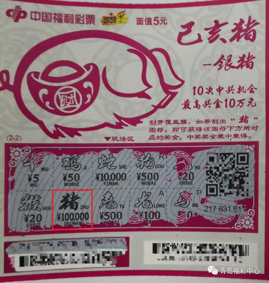 在青島地區(qū)購買本市銷售的“己亥豬”5元、10元票種(以物流碼為準(zhǔn)):“中10元再送5元即開票”。