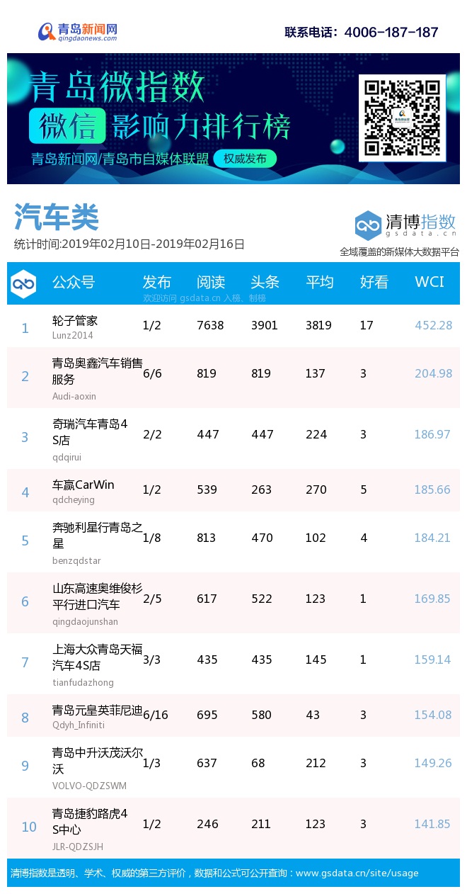 3、本次榜單收錄了青島14個行業(yè)微信公眾號,如您的賬號暫未收錄,可聯系4006-187-187。
