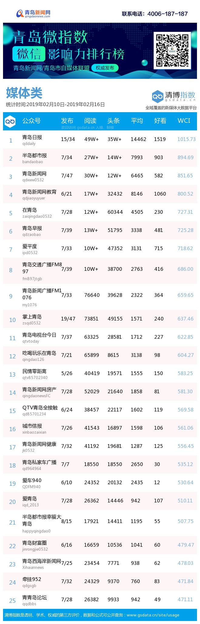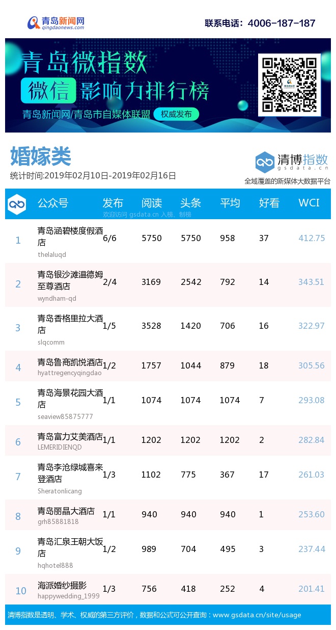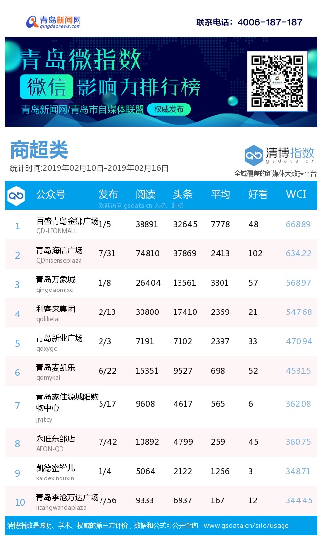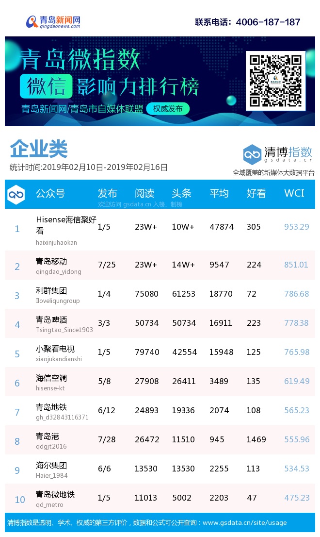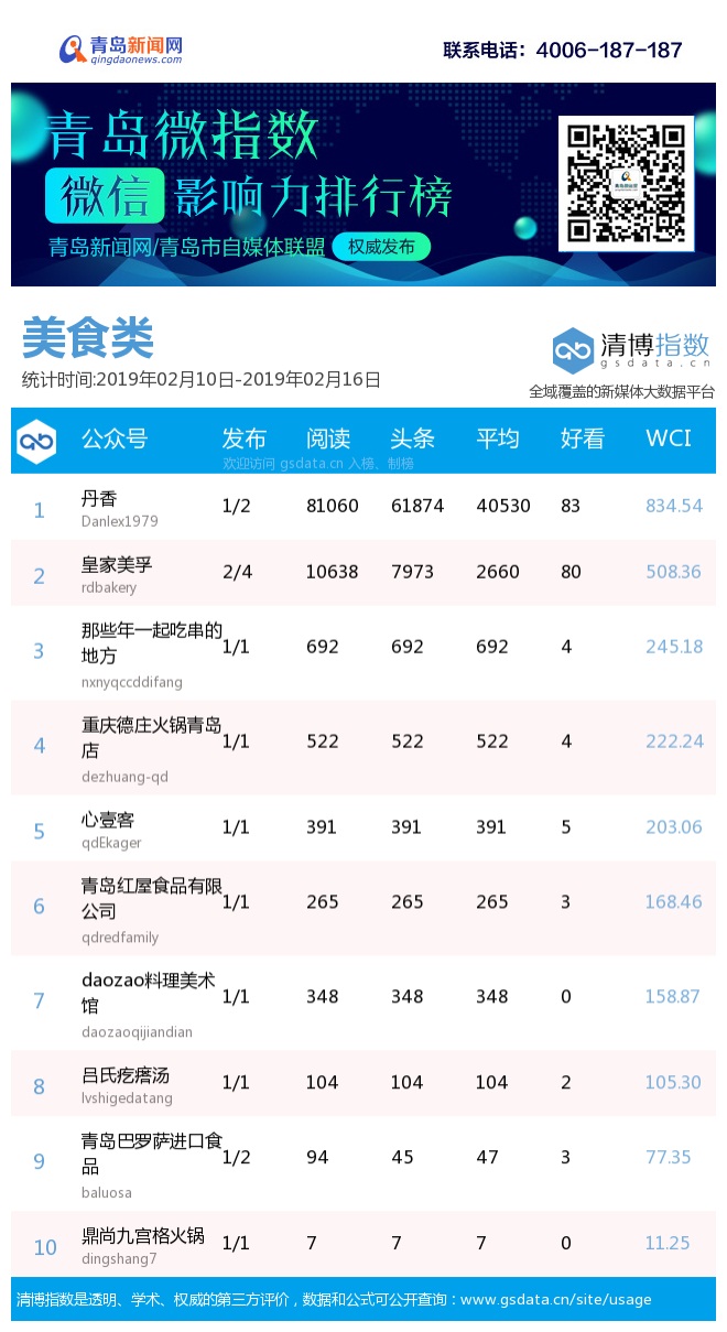 3、本次榜單收錄了青島14個(gè)行業(yè)微信公眾號(hào),如您的賬號(hào)暫未收錄,可聯(lián)系4006-187-187。