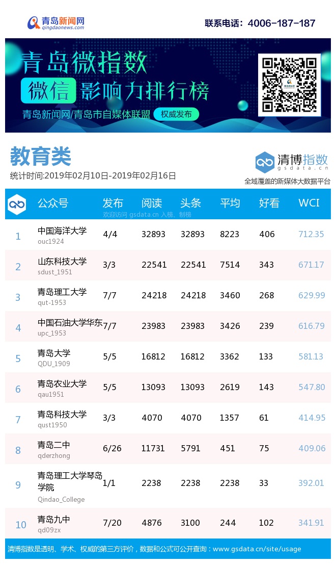 青島新聞網(wǎng)2月18日訊(記者 邢書玲)由青島新聞網(wǎng)、清博指數(shù)平臺(tái)聯(lián)手打造的“青島微指數(shù)微信影響力排行榜”今日發(fā)布一周(2月10日-2月16日)榜單。