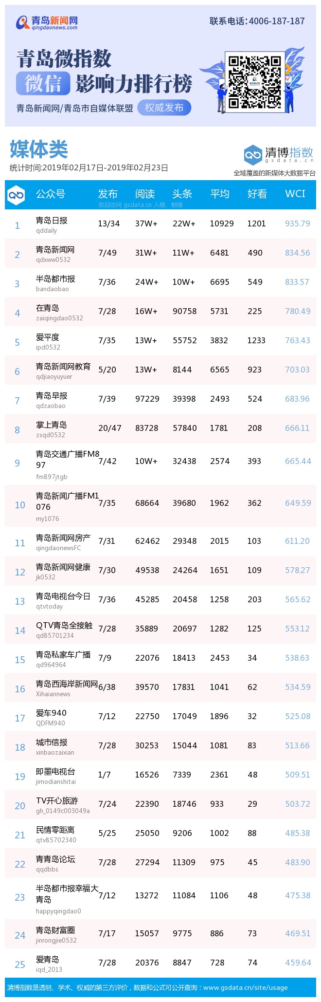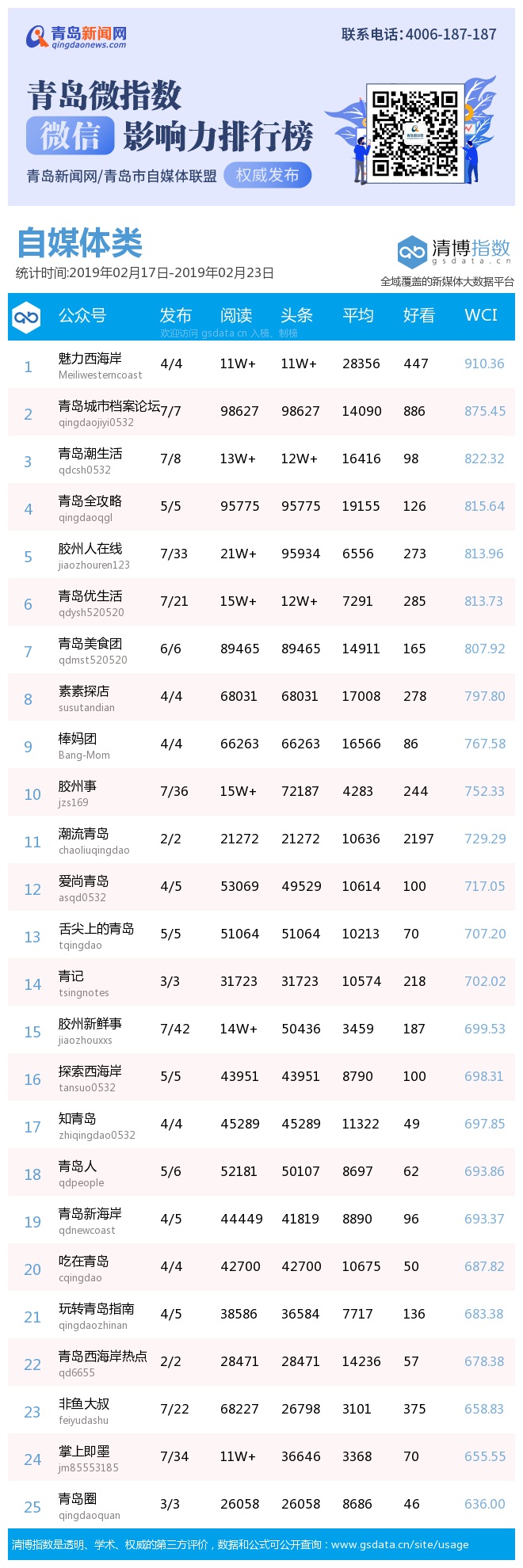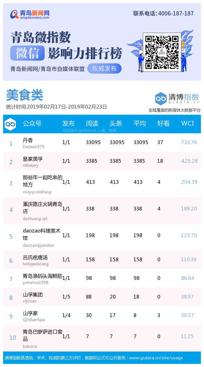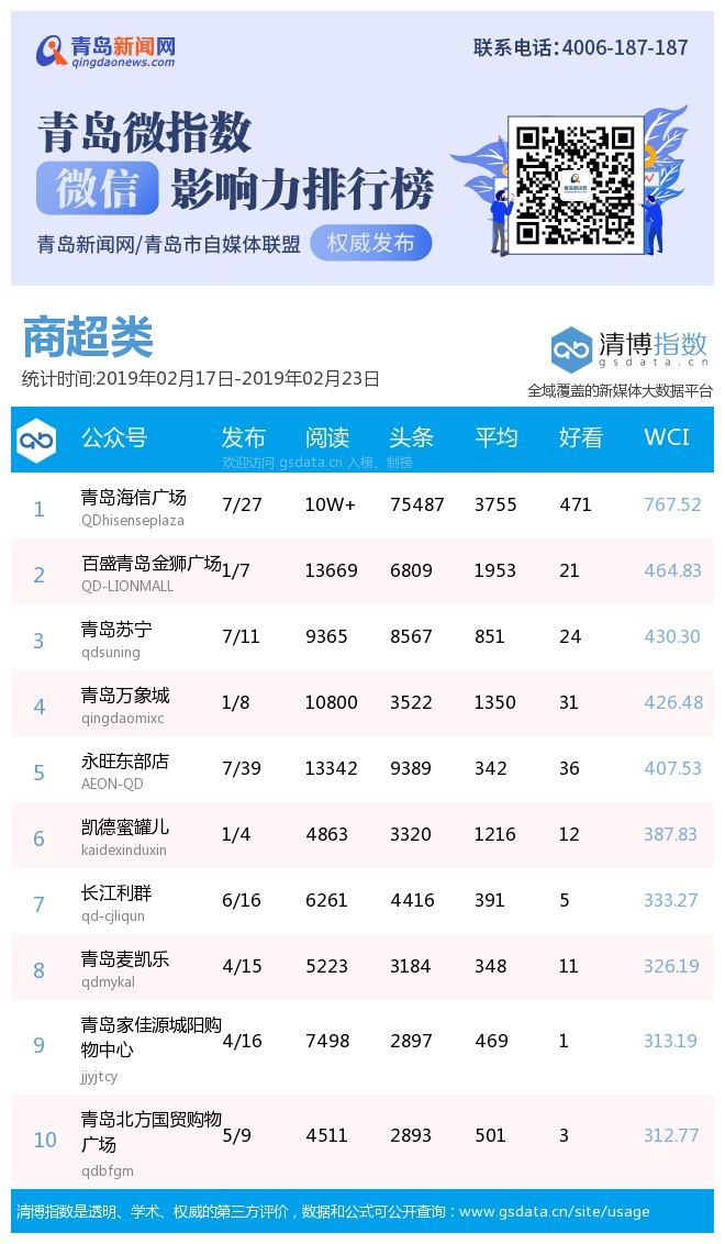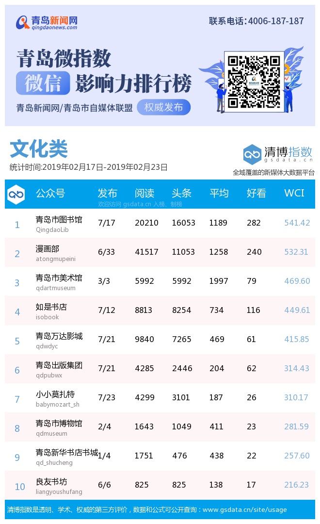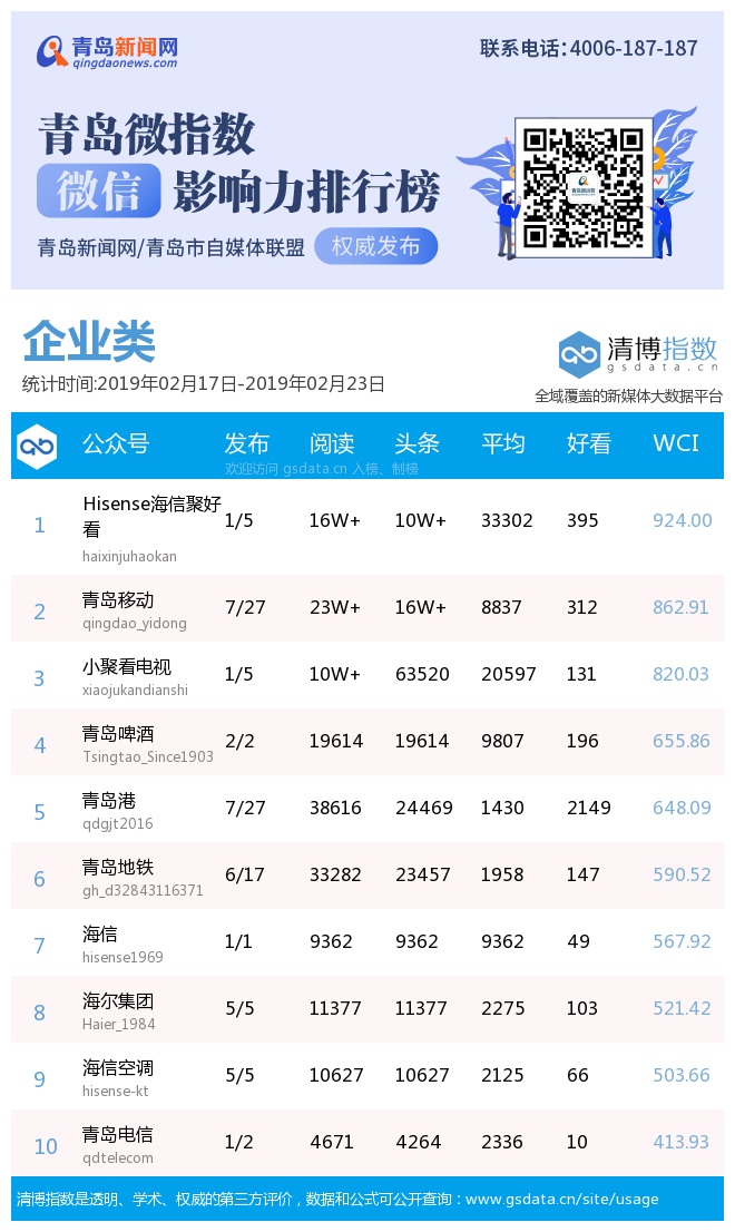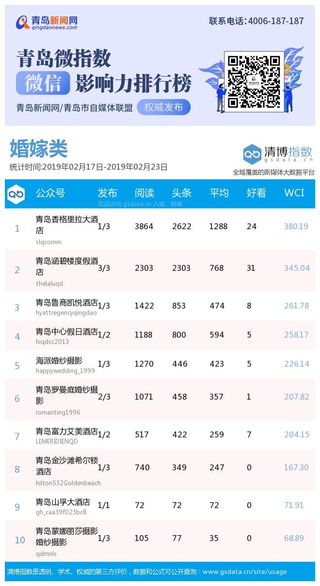 3、本次榜單收錄了青島14個行業(yè)微信公眾號,如您的賬號暫未收錄,可聯(lián)系4006-187-187。