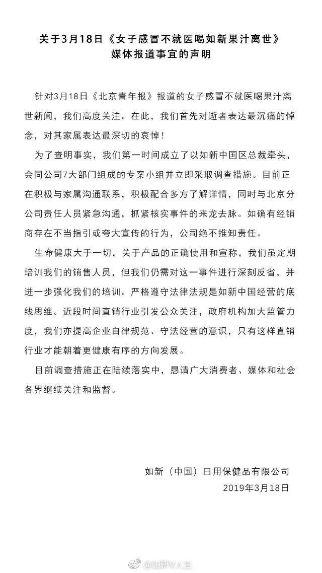 3月18日,媒體報道“女子感冒不就醫(yī)喝如新果汁離世”一事引發(fā)關(guān)注。18日晚,如新(中國)日用保健品有限公司(以下簡稱“如新”)向南方+發(fā)來聲明。如新在聲明中表示,第一時間成立以如新中國區(qū)總裁牽頭,會同公司7大部門組成的專案小組并立即采取調(diào)查措施,目前正在積極與家屬溝通,配合多方了解詳情,如果核實經(jīng)銷商確實存在不當指引或夸大宣傳的行為,如新方面絕不推卸責(zé)任。