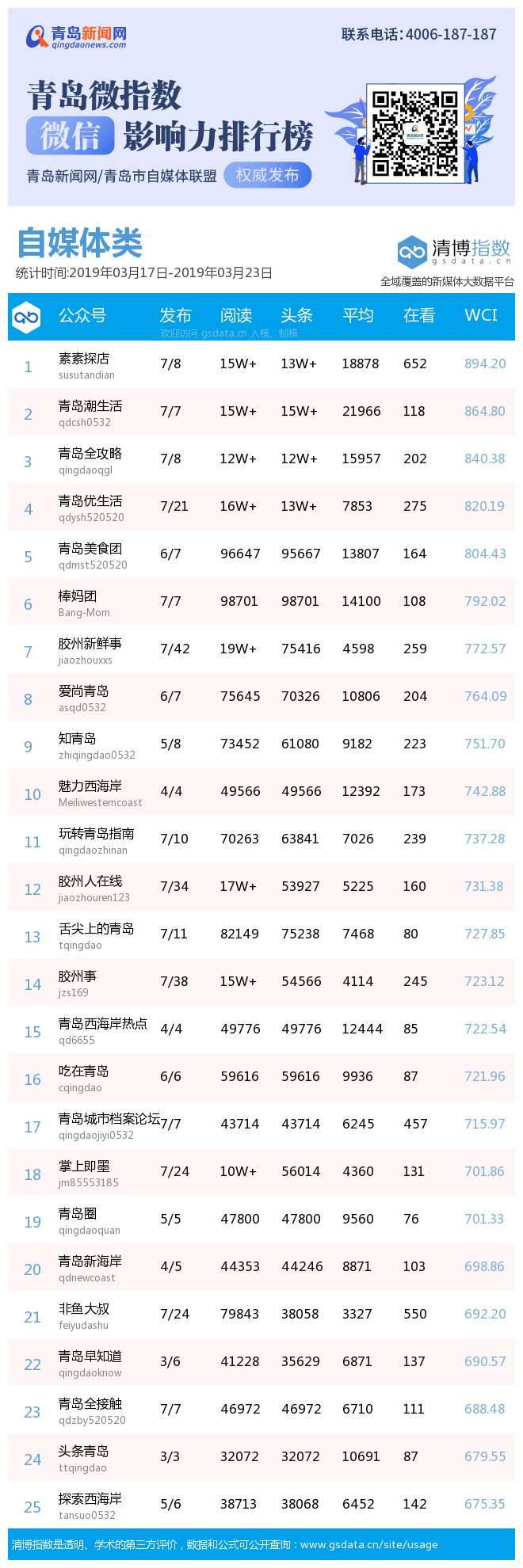 青島新聞網(wǎng)3月25日訊(記者 邢書玲)由青島新聞網(wǎng)、清博指數(shù)平臺聯(lián)手打造的“青島微指數(shù)微信影響力排行榜”今日發(fā)布一周(3月17日-3月23日)榜單。