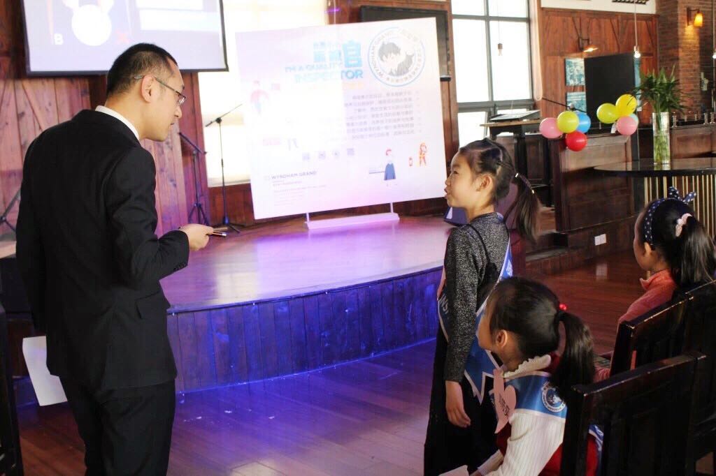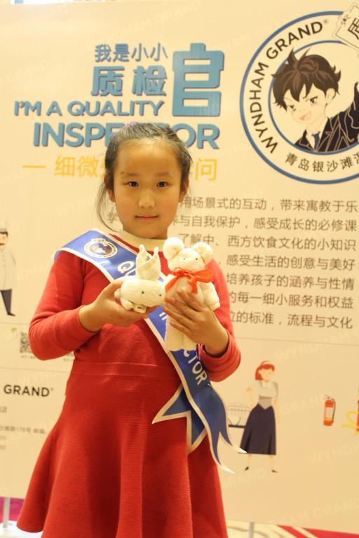 這里就是風(fēng)景秀麗、環(huán)境設(shè)施一流的青島銀沙灘溫德姆至尊酒店了!在春意盎然、清風(fēng)拂面的午后到達(dá)活動現(xiàn)場,小朋友們會先來到明亮舒適的大堂。熱情的禮賓人員早早等候在這里,帶領(lǐng)“小小質(zhì)檢官”們簽到。