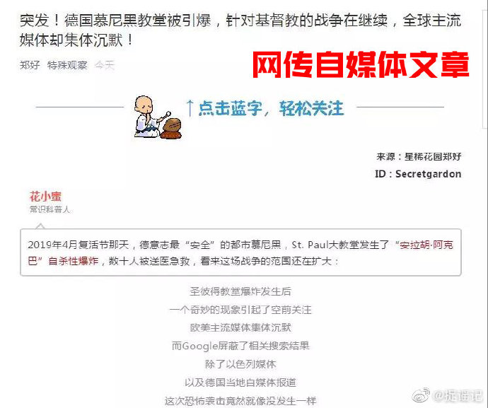 近日,一篇題為《突發(fā)!德國慕尼黑教堂被引爆,針對基督教的戰(zhàn)爭在繼續(xù),全球主流媒體卻集體沉默!》的自媒體文章在網(wǎng)上熱傳。文章指出,斯里蘭卡恐襲案后,不僅慕尼黑的圣保羅大教堂再次發(fā)生恐襲爆炸,就連美國、俄羅斯、非洲等多地基督教堂也是被燒得燒,炸的炸,針對基督教的戰(zhàn)爭已在全球范圍內(nèi)已經(jīng)進(jìn)行。