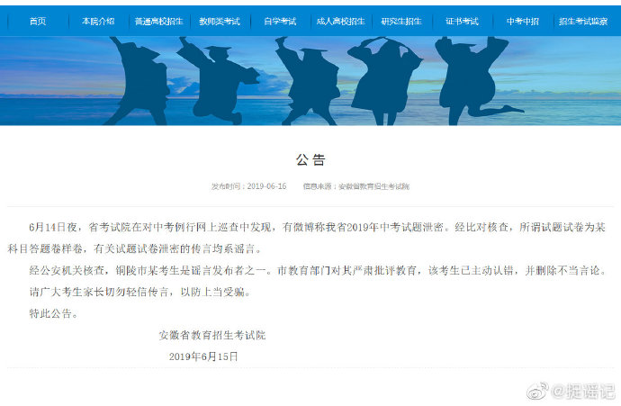 據(jù)安徽省教育招生考試院網(wǎng)站消息,6月16日,安徽省教育招生考試院發(fā)出公告稱(chēng),網(wǎng)傳安徽省2019年中考試題泄密系謠言,網(wǎng)傳所謂試題試卷為某科目答題卷樣卷。