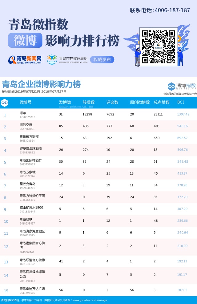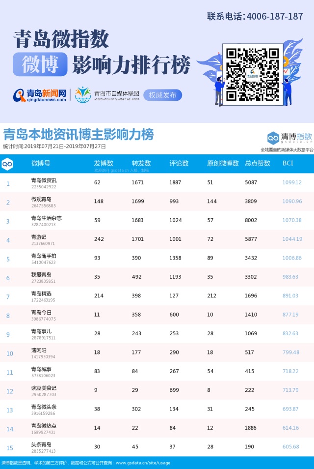 【微博】青島微指數(shù)微博影響力排行榜(7月21日-7月27日)