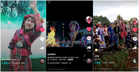 像覃誠芳這樣的民歌愛好者在抖音上還有很多。全國各地的民歌也通過抖音獲得了更廣更遠(yuǎn)的傳播。據(jù)不完全統(tǒng)計,抖音上共有102萬個國家級非遺民歌短視頻,產(chǎn)生了37億播放,獲得1.24億點贊。