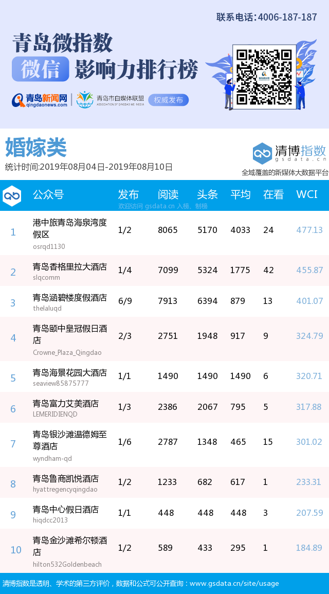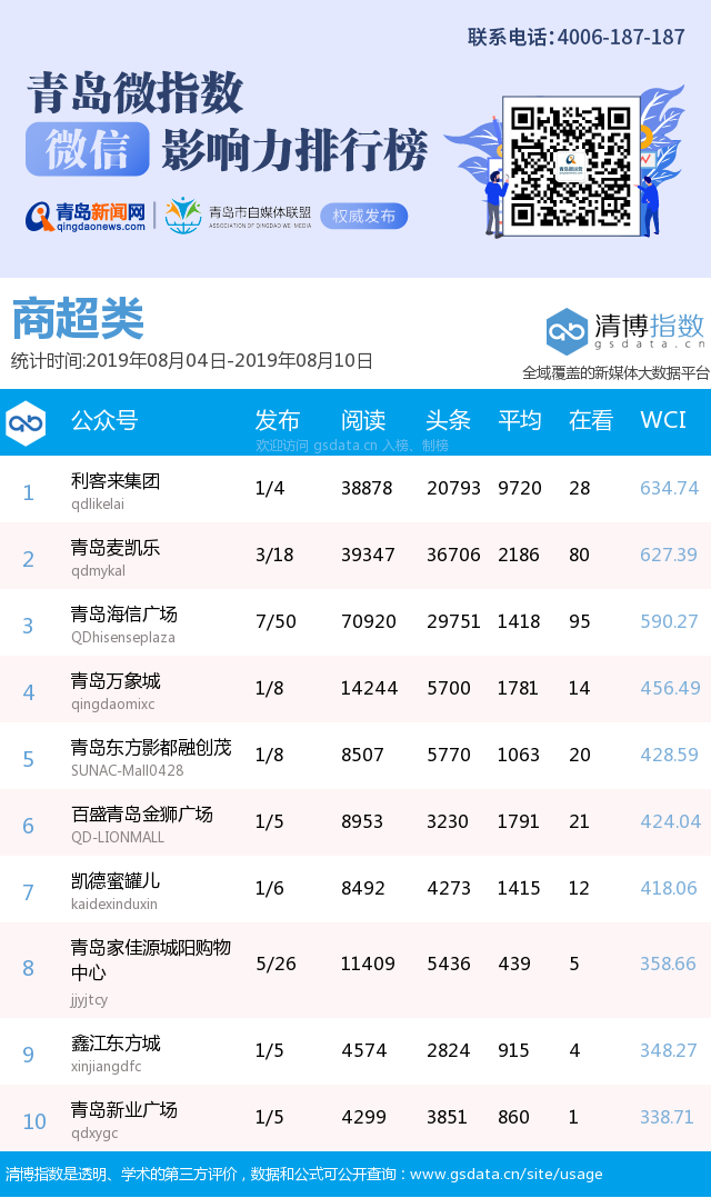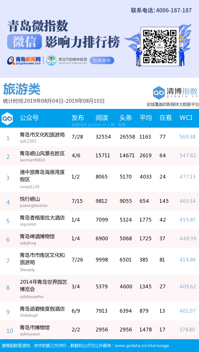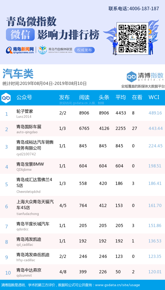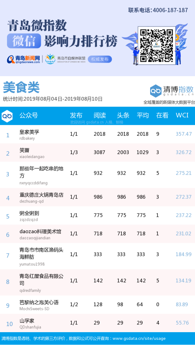 3、本次榜單收錄了青島14個(gè)行業(yè)微信公眾號(hào),如您的賬號(hào)暫未收錄,可聯(lián)系4006-187-187。
