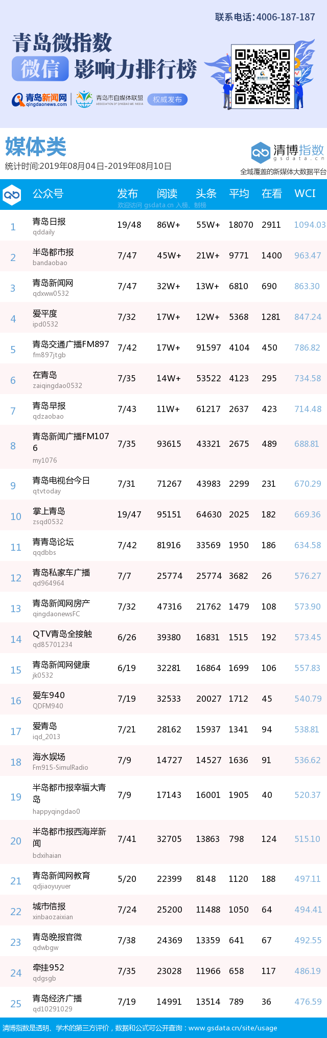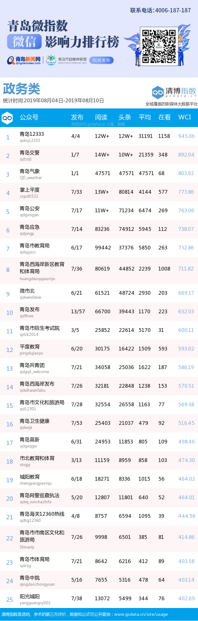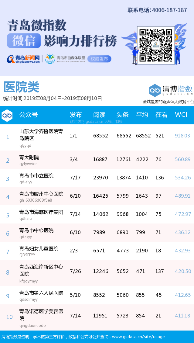 3、本次榜單收錄了青島14個(gè)行業(yè)微信公眾號(hào),如您的賬號(hào)暫未收錄,可聯(lián)系4006-187-187。