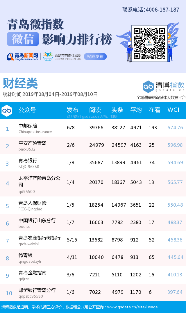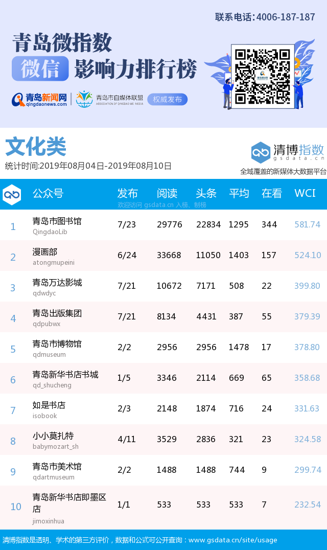 青島新聞網(wǎng)8月12日訊(記者 邢書玲)由青島新聞網(wǎng)、清博指數(shù)平臺(tái)聯(lián)手打造的“青島微指數(shù)微信影響力排行榜”今日發(fā)布一周(8月4日-8月10日)榜單。