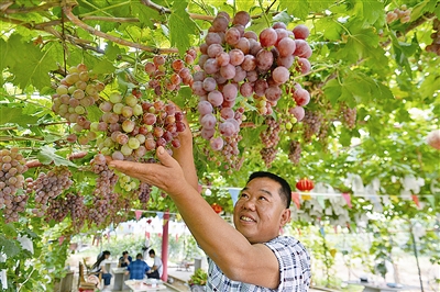 “因為種葡萄,俺莊戶人的生活已經(jīng)發(fā)生了翻天覆地的變化,不僅生活條件好了,還幫孩子在城里買上了房子。”從1984年就開始種植葡萄的果農(nóng)劉元九說。30多年的葡萄種植經(jīng)歷,也讓劉元九見證了大澤山葡萄作為農(nóng)產(chǎn)名品價格的“一路飆升”,從2000年初的每公斤不到2元,到如今玫瑰香、澤山一號等“大眾品種”的一公斤10到20元。此外,當?shù)卣蔡峁┱呷轿环龀制咸褍?yōu)勢產(chǎn)業(yè)發(fā)展,夯實“大澤山葡萄”名牌根基。在如“農(nóng)民每新發(fā)展一畝優(yōu)質(zhì)葡萄,政府補助1000元,農(nóng)民每新建一個設(shè)施大棚,政府補助20000元”等政策的帶動下,許多像劉元九一樣的果農(nóng)伴隨著“大澤山”葡萄這一品牌的發(fā)展壯大,走上了致富之路。