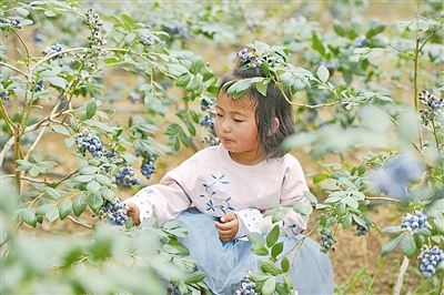 ▲一位小朋友在西海岸新區(qū)藍莓種植基地內(nèi)采摘。
