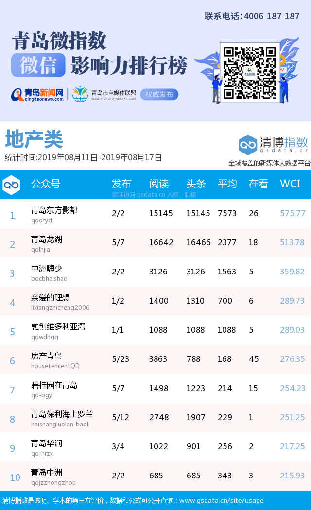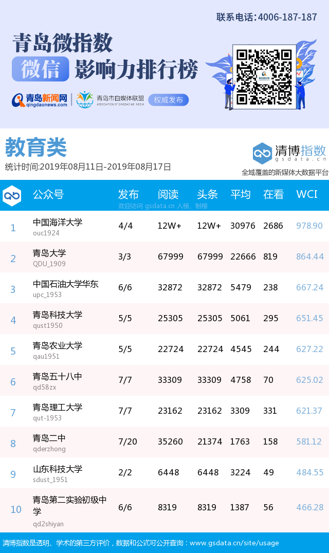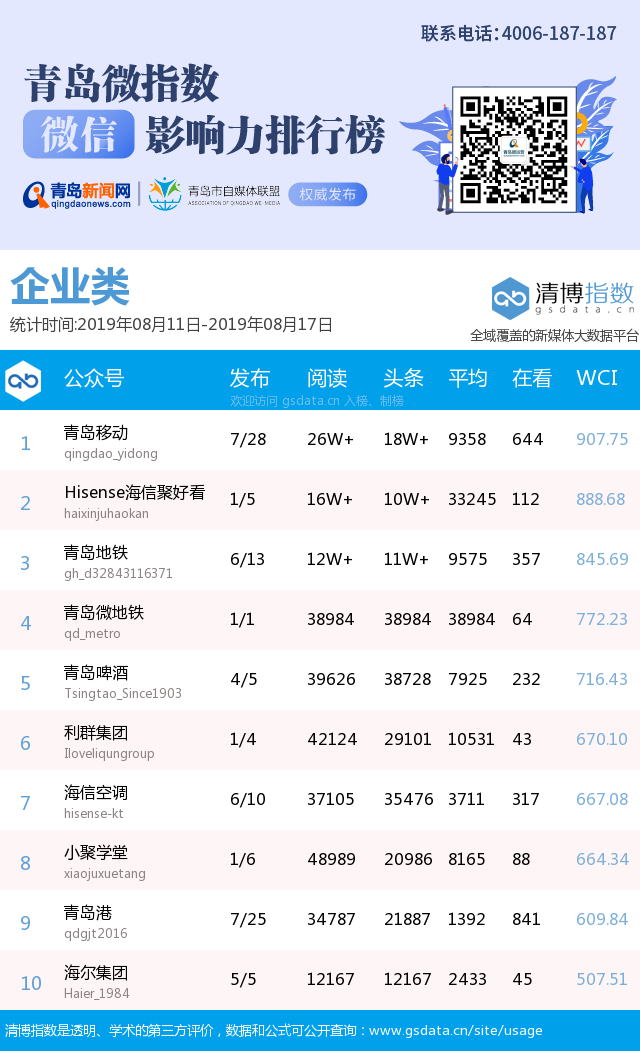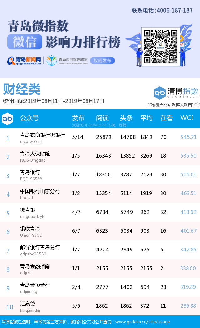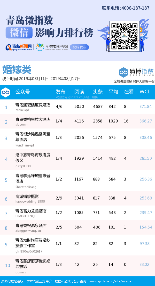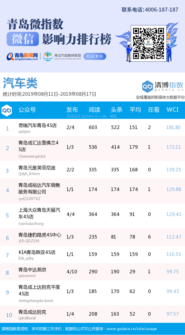 3、本次榜單收錄了青島14個(gè)行業(yè)微信公眾號(hào),如您的賬號(hào)暫未收錄,可聯(lián)系4006-187-187。