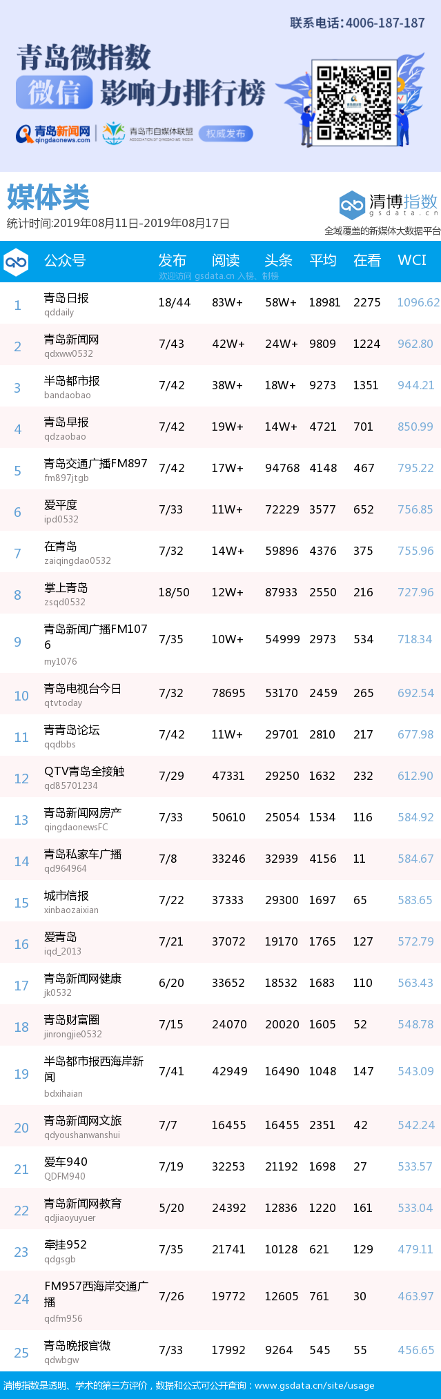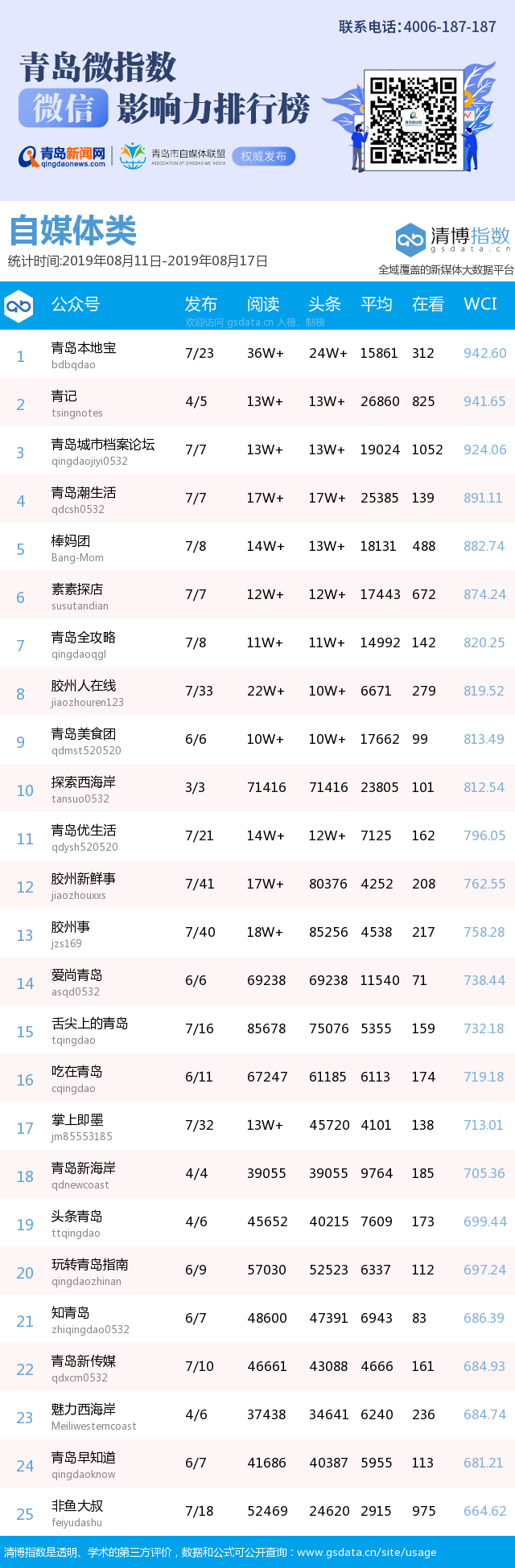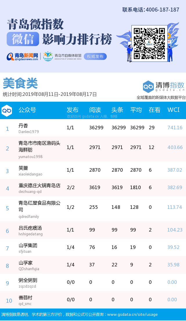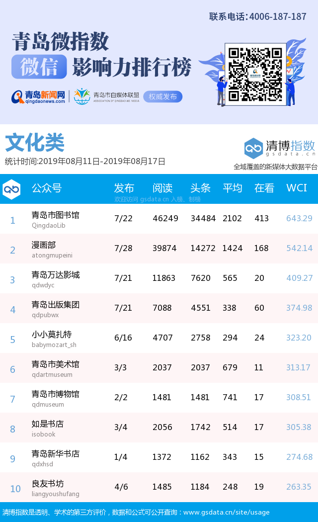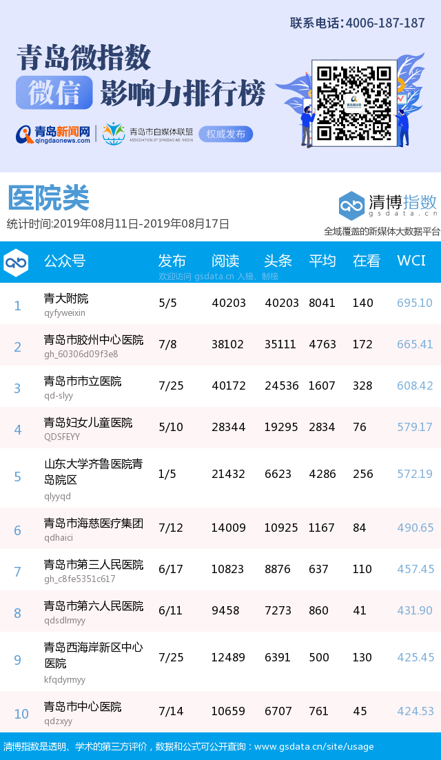 3、本次榜單收錄了青島14個(gè)行業(yè)微信公眾號(hào),如您的賬號(hào)暫未收錄,可聯(lián)系4006-187-187。