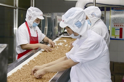 走進青島寶泉花生制品有限公司,濃濃的花生香沁入心脾。在裹衣車間,記者看到一批裹衣花生制品正從生產線下線,完成稱量包裝待發(fā)。