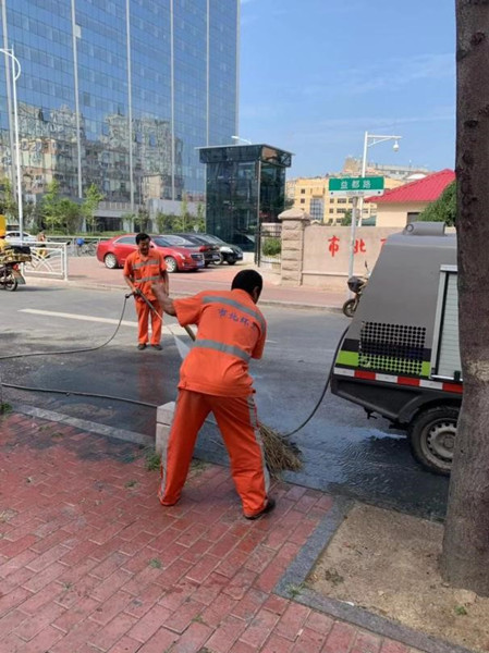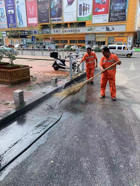 工人們頂著烈日和刺鼻的異味,使用灑水車邊灑水邊用掃帚一點(diǎn)一點(diǎn)的將厚達(dá)2厘米的污水淤泥清理干凈。之后再多次反復(fù)沖洗路面,經(jīng)過(guò)工人們40多分鐘的集中清理,最終使現(xiàn)場(chǎng)道路恢復(fù)原貌。