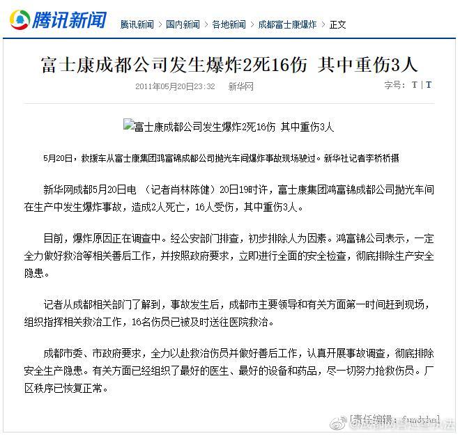 【網(wǎng)警辟謠:“成都富士康爆炸死亡300人”系謠言】