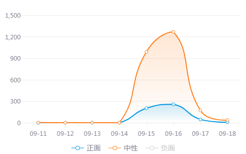 從情感走勢圖中,我們可以看到9月15日開始,關(guān)于“70年70城記住青島”正面報道直線上升,此時正是“70年70城記住青島”視頻發(fā)布的當(dāng)天,9月16日,經(jīng)過各大平臺傳播,接近1200+的峰值。