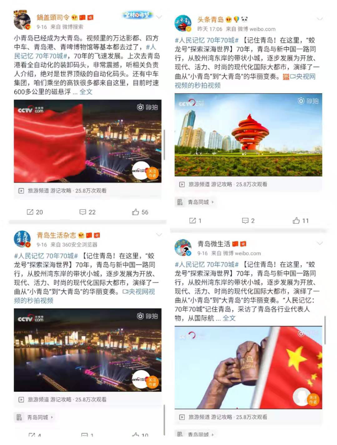 9月15日,【70年70城】青島篇正式上線,并迅速在新浪、騰訊、今日頭條、鳳凰、網(wǎng)易、百度等平臺傳播開來,截止到9月18日下午15:00,央視網(wǎng)發(fā)布的“【70年70城】 #記住青島!在這里,‘蛟龍?zhí)枴剿魃詈J澜纭眱?nèi)容,在秒拍視頻收獲261.5萬+播放,騰訊視頻收獲1648.1萬+播放。