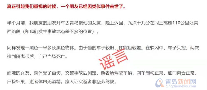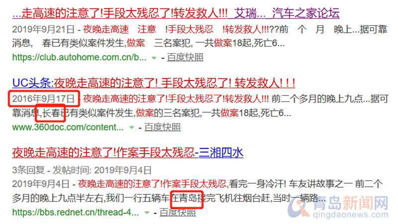 經(jīng)“山東高速交警”核實,青島、煙臺高速交警近年來均未接到過有關投擲障礙物從而引發(fā)交通事故進行搶劫類的警情,文中所提到的同三高速已于2007年改名為沈海高速,威烏高速也已于2007年改名為榮烏高速。2009年以來該虛假信息在互聯(lián)網(wǎng)多次傳播,為此“青島公安”在2012年10月2日,通過微博專門發(fā)布過辟謠信息。