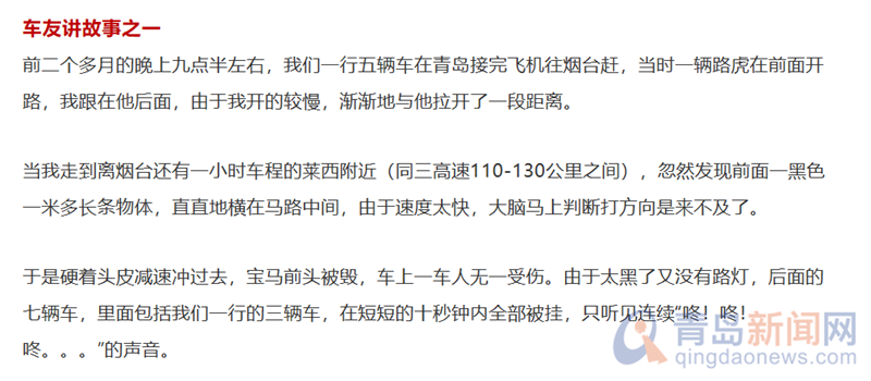 文中寫到,青島到煙臺路段出現(xiàn)高速公路搶劫事件,其搶劫方式以汽車保險杠為路障,致使行駛車輛發(fā)生車禍,并趁車主急需救援時上車搶劫。該文因描述事件駭人聽聞且切實關系到萊西路段高速行車安全,而引起人們的恐慌。