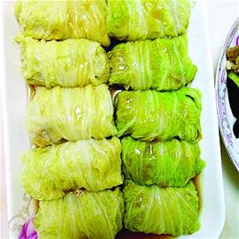 這道菜也是膠州、城陽等地的百姓菜品。廚師出身的史勝強(qiáng)現(xiàn)在擔(dān)任鑫復(fù)盛餐飲公司服務(wù)中心總監(jiān),善于從百姓的菜品中尋找靈感。這道菜就是史勝強(qiáng)在膠州看到的,加以改進(jìn),增加了肉餡和海米,味道更濃郁。史勝強(qiáng)介紹,把膠州大白菜的菜幫和老葉剁餡加肉餡和泡好的海米調(diào)味,嫩葉部分上鍋蒸軟做皮。用白菜葉包裹白菜餡兒上籠蒸熟即可。