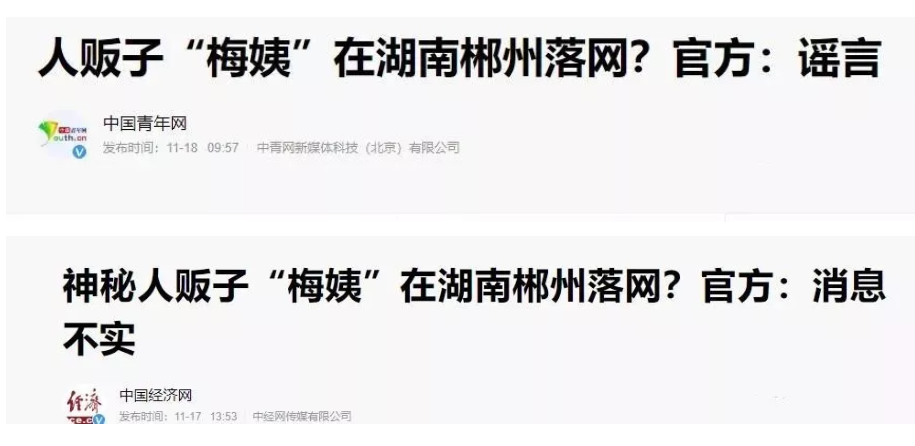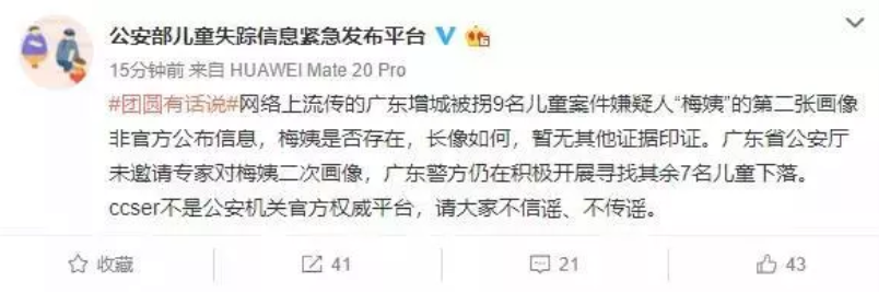 11月17日,人販子“梅姨”畫像被“官方”爆出,幾天之間朋友圈、微博熱搜各大V紛紛轉(zhuǎn)發(fā)。不久之后,公安部兒童失蹤信息緊急發(fā)布平臺官方微博發(fā)布辟謠消息: