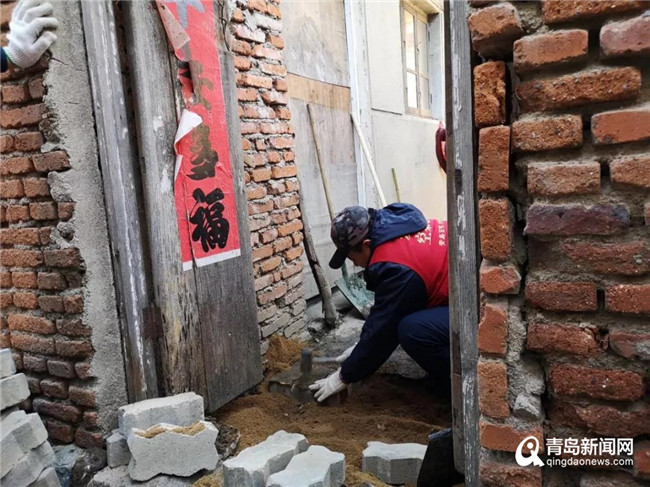 王祝才大爺家,志愿者特意為老人帶來了掃院子的大掃帚和洗潔精。大家七手八腳的開始卸磚卸沙,他們這又要忙活啥?原來,上次探望時(shí),看到王大爺家院門處的泥土已松散,積水堆積,董書記建議大家用水泥磚塊來鋪墊。志愿者們這是繼兩個(gè)月前為老人打水泥地面之后的又一次大動(dòng)干戈。董書記拿起鐵鍬和鋤頭與志愿者一同加入到鋪墊地面的行動(dòng)中,志愿者程剛從家中帶來鋪地面專用的皮錘,陳世國(guó)和李啟筍做下手,志愿者的手藝一點(diǎn)也不亞于專業(yè)水平,這門檻的水泥磚鋪的讓人看著心里就舒坦,王大爺看著更是順心。志愿者辛偉麗和孟珂則在屋內(nèi)為老人清理洗碗盆中堆積的盤子和碗。李啟筍則為王大爺洗頭理發(fā)。