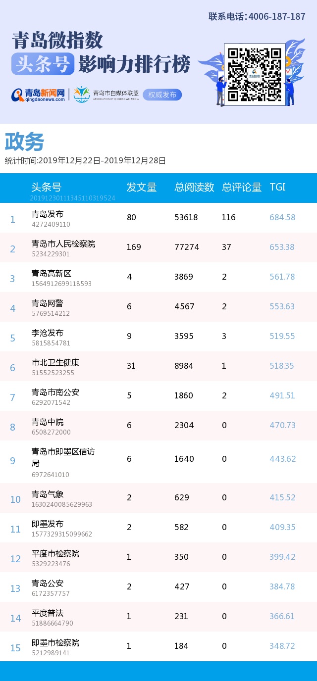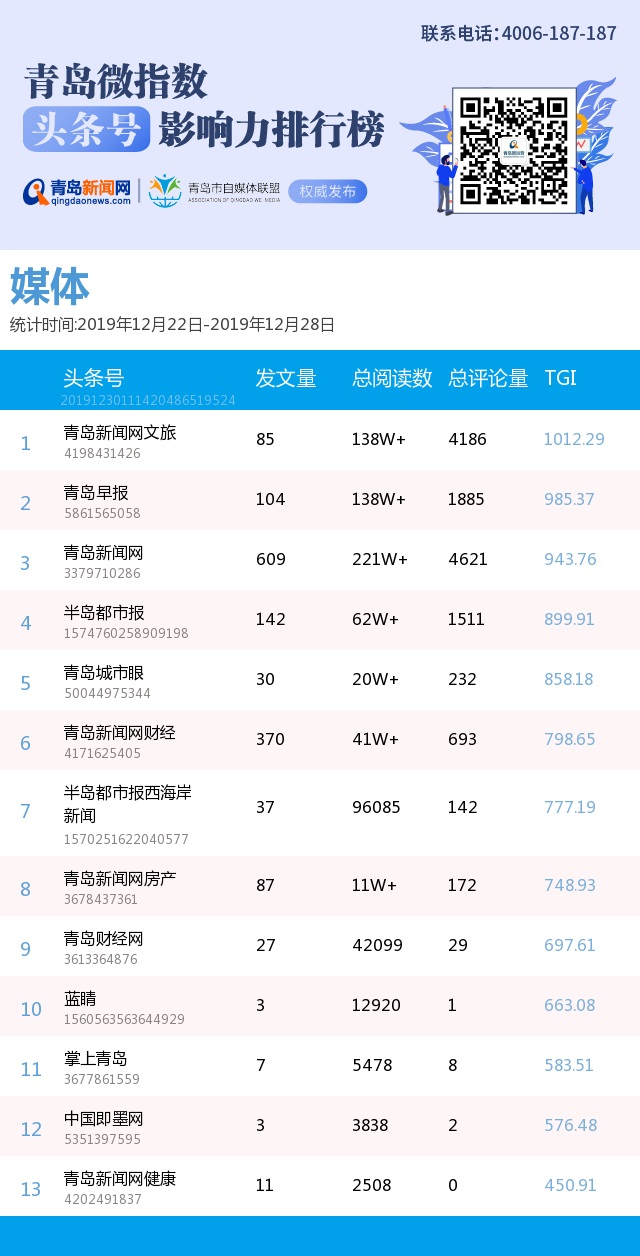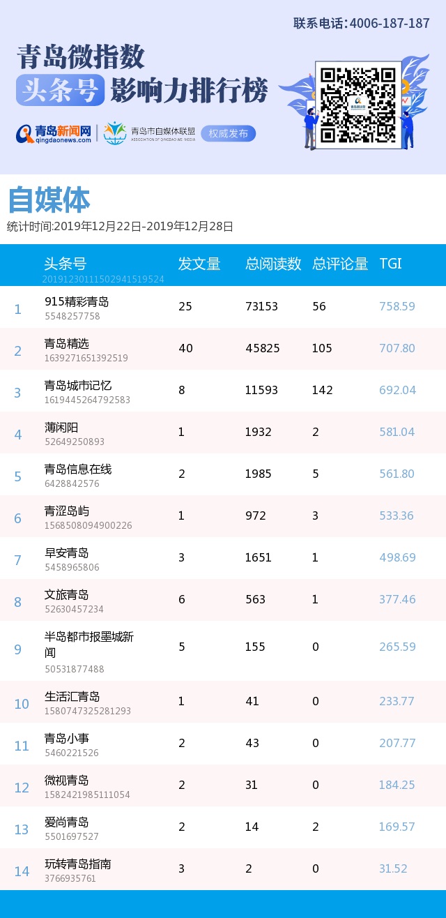 【頭條】青島微指數(shù)頭條號影響力排行榜(12月22日-12月28日)“915精彩青島”登頂