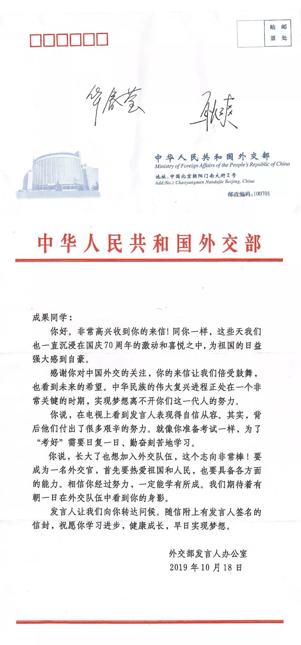 超銀小學(xué)推出的“家長職業(yè)生涯體驗”選修課幫助學(xué)生了解不同職業(yè)的工作內(nèi)容,提升職業(yè)生涯規(guī)劃能力。二年級4班的成果深受這一課程和家庭教育的影響,從小樹立了與外交官工作相關(guān)的夢想。2019年國慶前夕,為了祝福祖國母親70周年華誕,成果抱著試試看的心態(tài)給外交部寫了一封信,沒想到很快就收到了回信,隨信還附上了我們耳熟能詳?shù)耐饨徊堪l(fā)言人華春瑩、耿爽的親筆簽名信封。“我覺得非常開心和自豪,我一定會像信里說的那樣,好好學(xué)習(xí),健康成長,早日實現(xiàn)成為一名外交官的夢想!”成果興奮地說。
