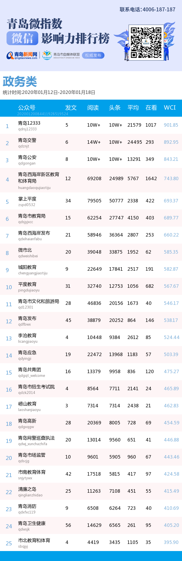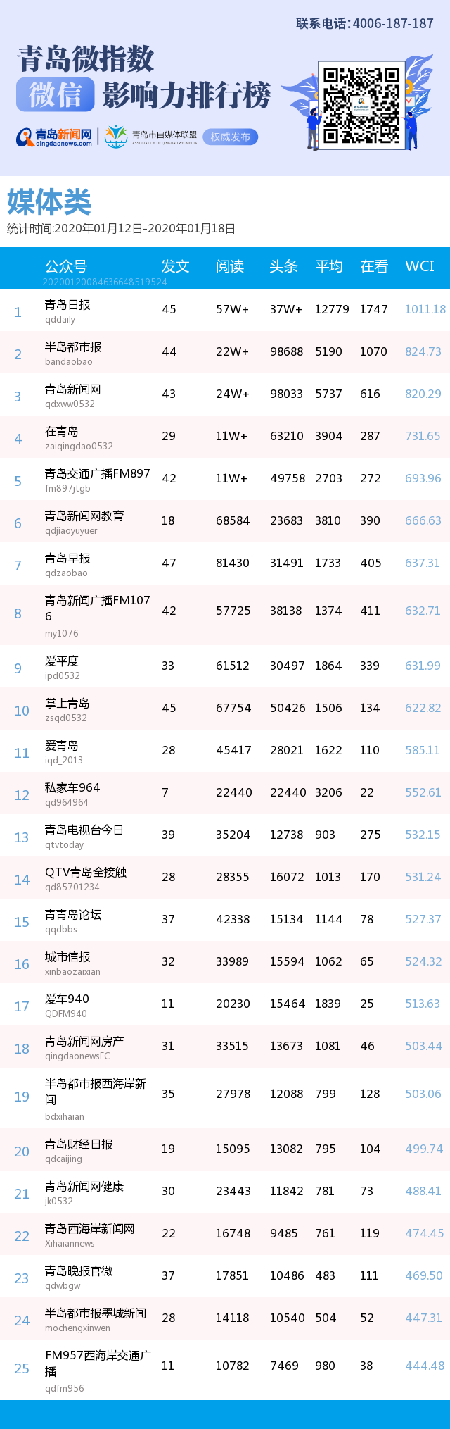 青島微指數(shù)微信影響力排行榜(1月12日-1月18日)