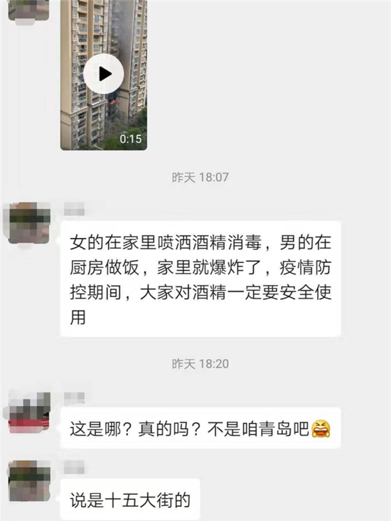 記者經(jīng)過核實(shí)發(fā)現(xiàn),在上海、武漢均發(fā)現(xiàn)了類似的傳言,而且傳言中的視頻,和青島的這段視頻一模一樣。這些傳言稱,是居民在家噴灑酒精消毒,遇到做飯的明火將房屋引燃。但是,上海、武漢等地消防部門均已第一時(shí)間辟謠。2月5日上午,記者聯(lián)系了青島市消防救援支隊(duì)后獲悉,青島市消防救援支隊(duì)近期并沒有到十五大街出過警,這一消息并不屬實(shí)。
