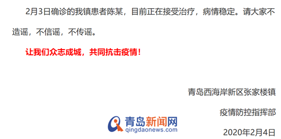青島新聞網(wǎng)2月5日訊(記者 丁淑華)日前,有人在網(wǎng)上散播消息稱:青島西海岸新區(qū)張家樓鎮(zhèn)居民因新型冠狀病毒感染的肺炎病故,引發(fā)市民恐慌。昨日,張家樓鎮(zhèn)人民政府官方微信公眾號(hào)發(fā)布情況說明進(jìn)行辟謠:2月3日確診的患者陳某,目前正在接受治療,病情穩(wěn)定。請(qǐng)大家不造謠,不信謠,不傳謠。