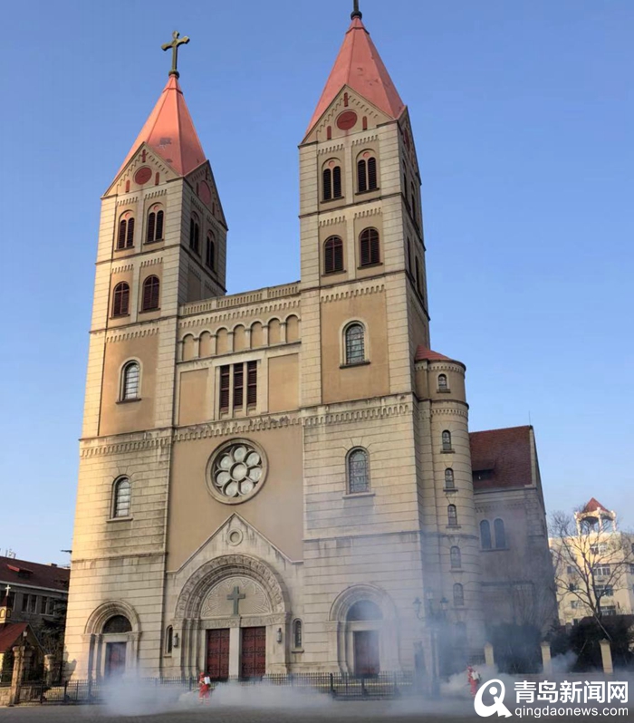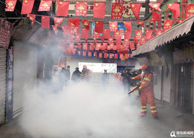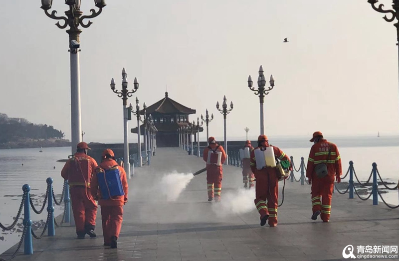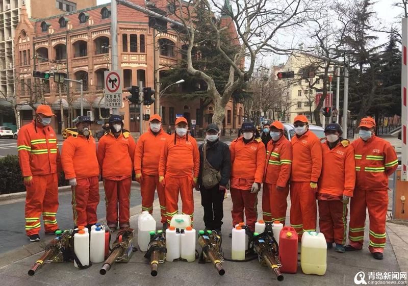 中山路街道“中山紅”志愿服務(wù)隊,消殺市南區(qū)天主教堂一帶。