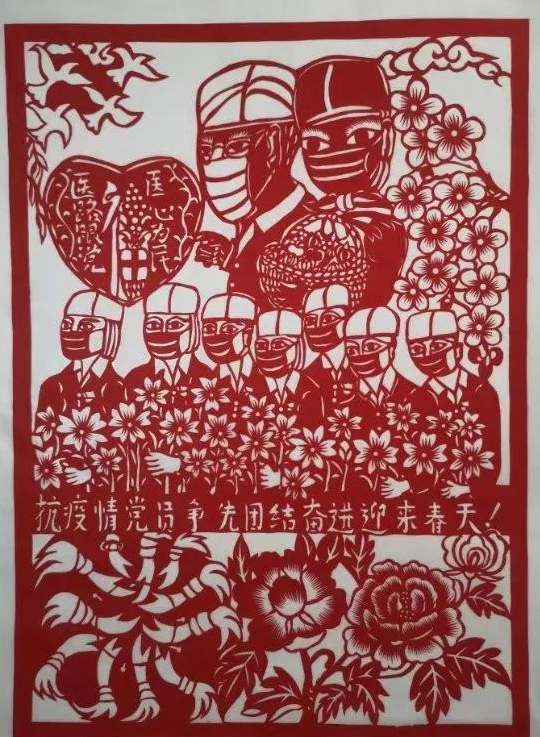 這幅作品名叫《抗疫情黨員爭先》,程丕昉解釋道:鴿子、祥云象征友誼、吉祥,兩位老百姓挎著果籃前來慰問抗擊疫情一線的醫(yī)護(hù)人員,這代表了醫(yī)民同心,共抗疫情,是期望我們?nèi)f眾一心,順利戰(zhàn)勝疫情。一顆紅心里面寫著“醫(yī)路跟黨、醫(yī)心為民”,這代表醫(yī)護(hù)工作者堅決執(zhí)行黨和國家的方針政策,心系人民健康,不畏疫情艱險,堅守崗位,保障人民身體健康。剪紙下方的牡丹是盛世之花,寓意著我們定能戰(zhàn)勝疫情,迎來美好的春天!