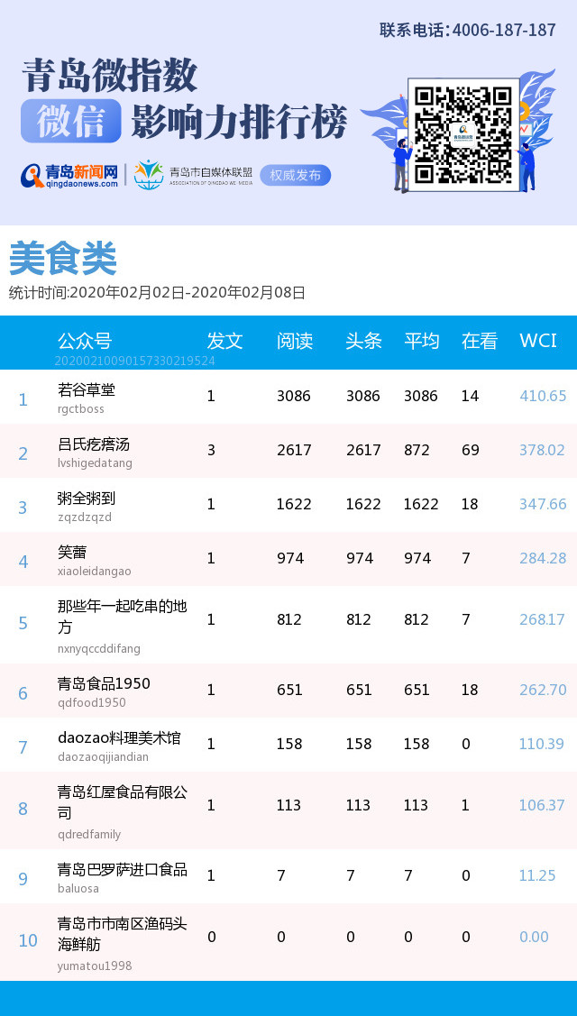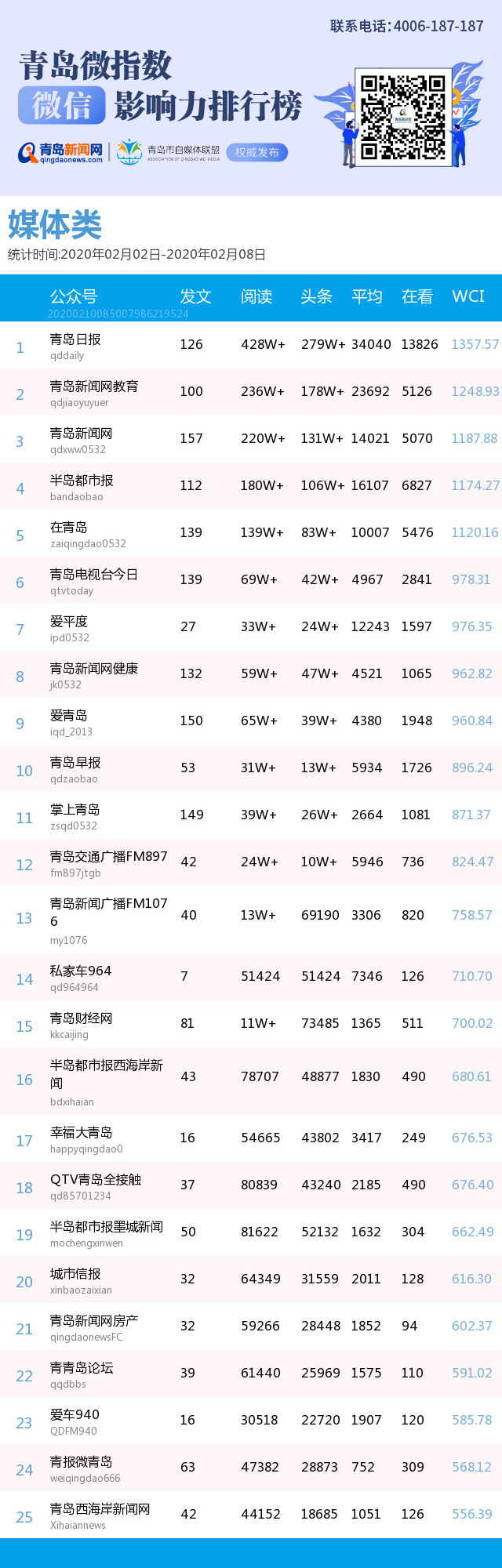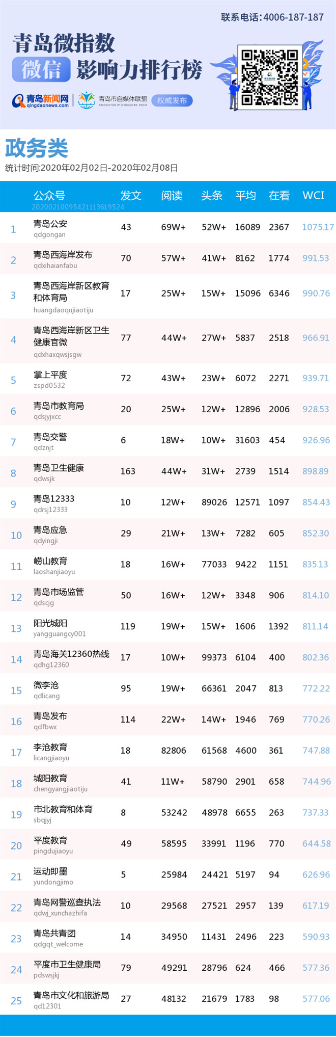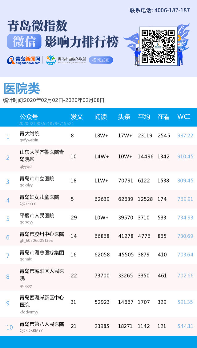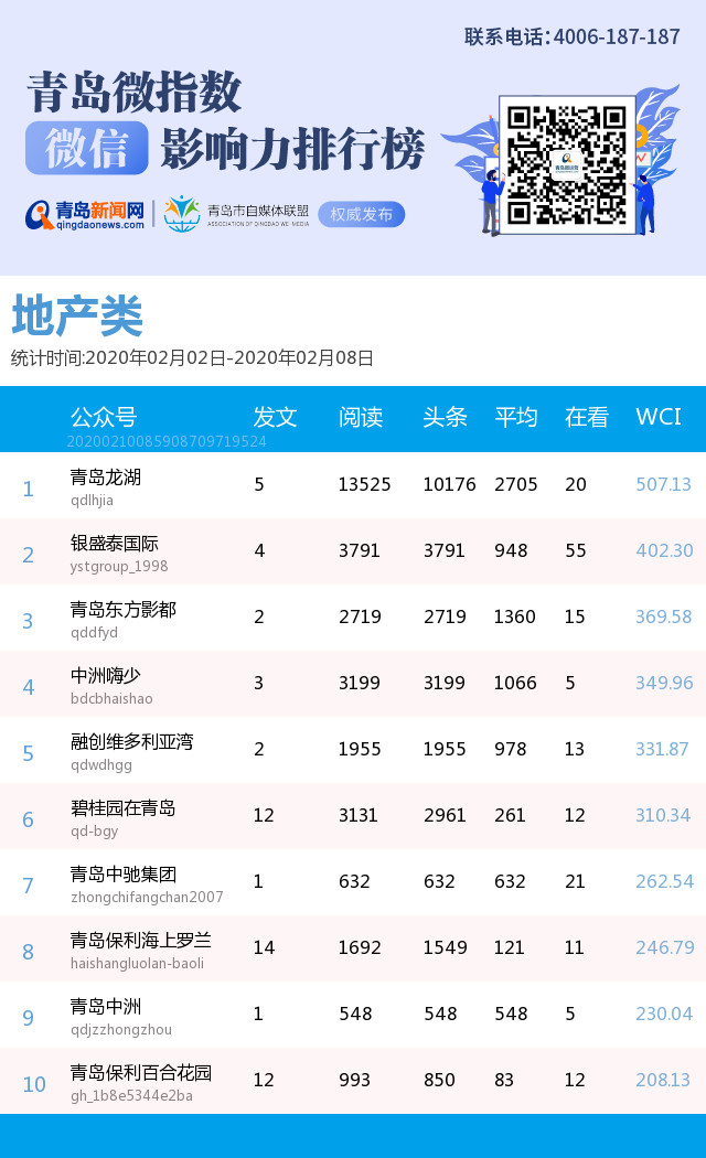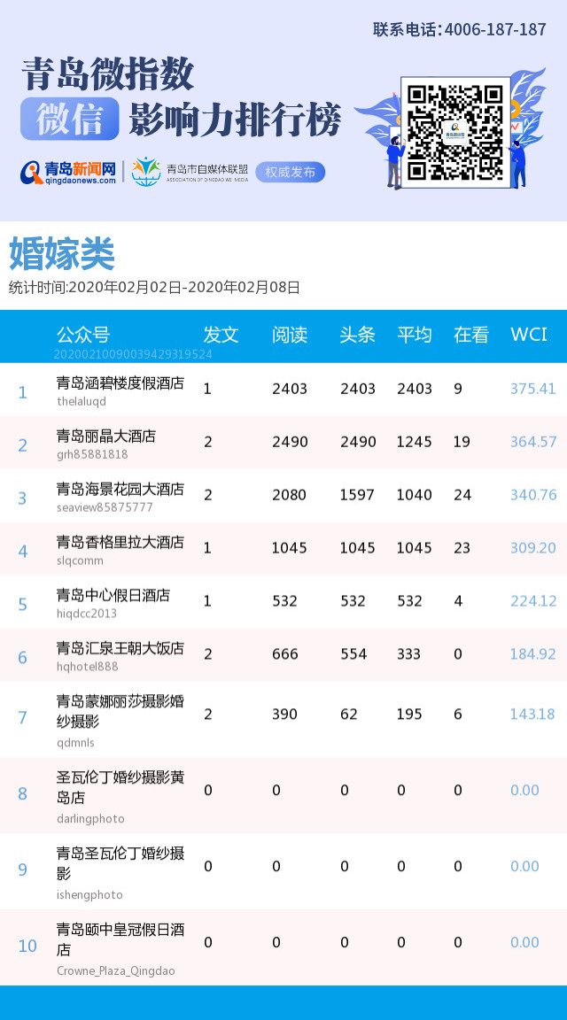 3、本次榜單收錄了青島14個行業(yè)微信公眾號,如您的賬號暫未收錄,可聯(lián)系4006-187-187。