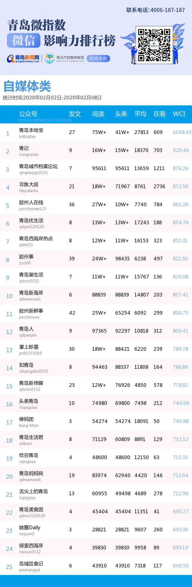 青島新聞網(wǎng)2月10日訊(記者 邢書玲)由青島新聞網(wǎng)打造的“青島微指數(shù)微信影響力排行榜”今日發(fā)布一周(2020年2月2日-2020年2月8日)榜單。